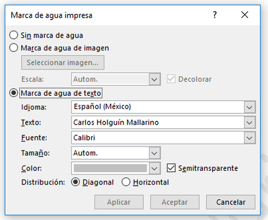 Vamos a colocar una marca de agua personalizada, con el nombre de Carlos Holguín Mallarino, entramos por la opción Marcas de agua personalizadas